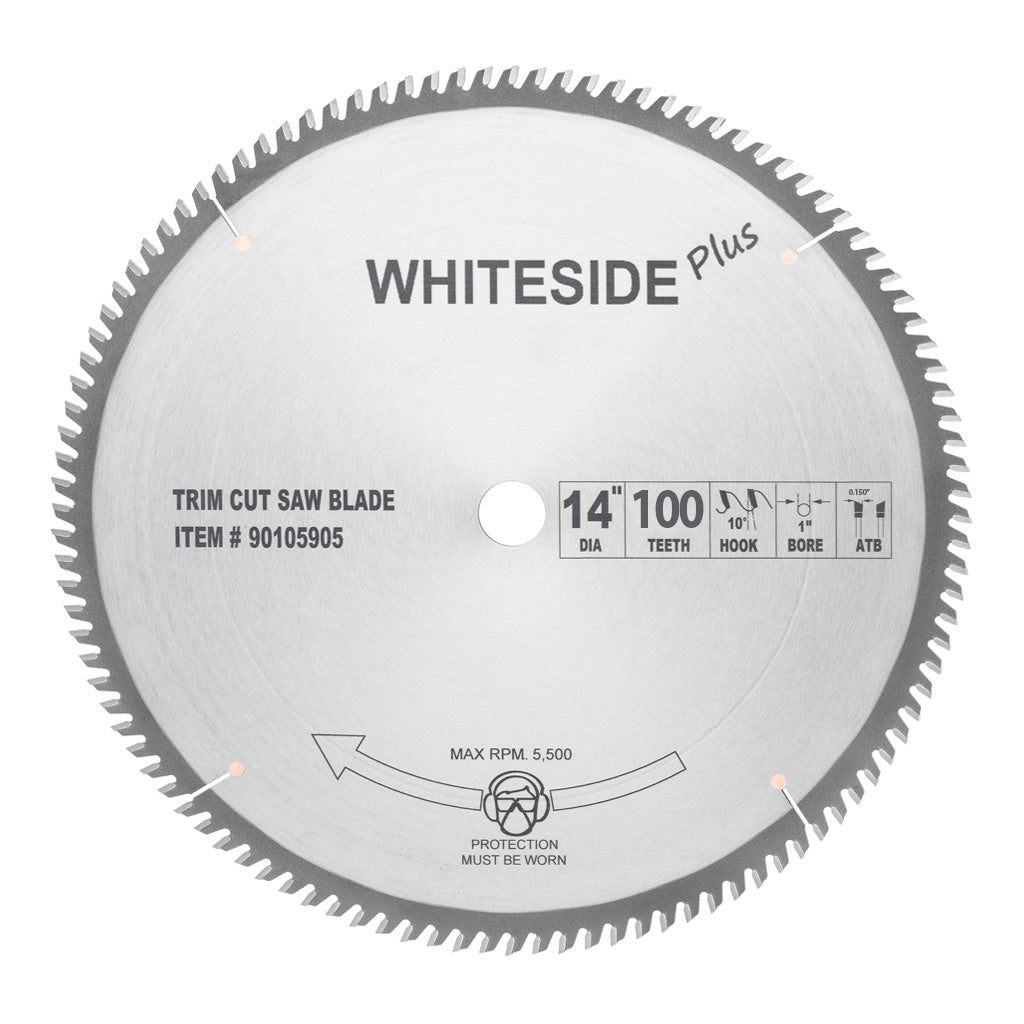 Trim Cut Blades are designed with a finer tooth configuration for finish work. The 10° hook angle provides effortless feeding, and the high tooth count produces clean, chip-free cutting. The ATB grind produces a superb finish even when crosscutting hardwoods, softwoods, plywood, and wood veneers.
